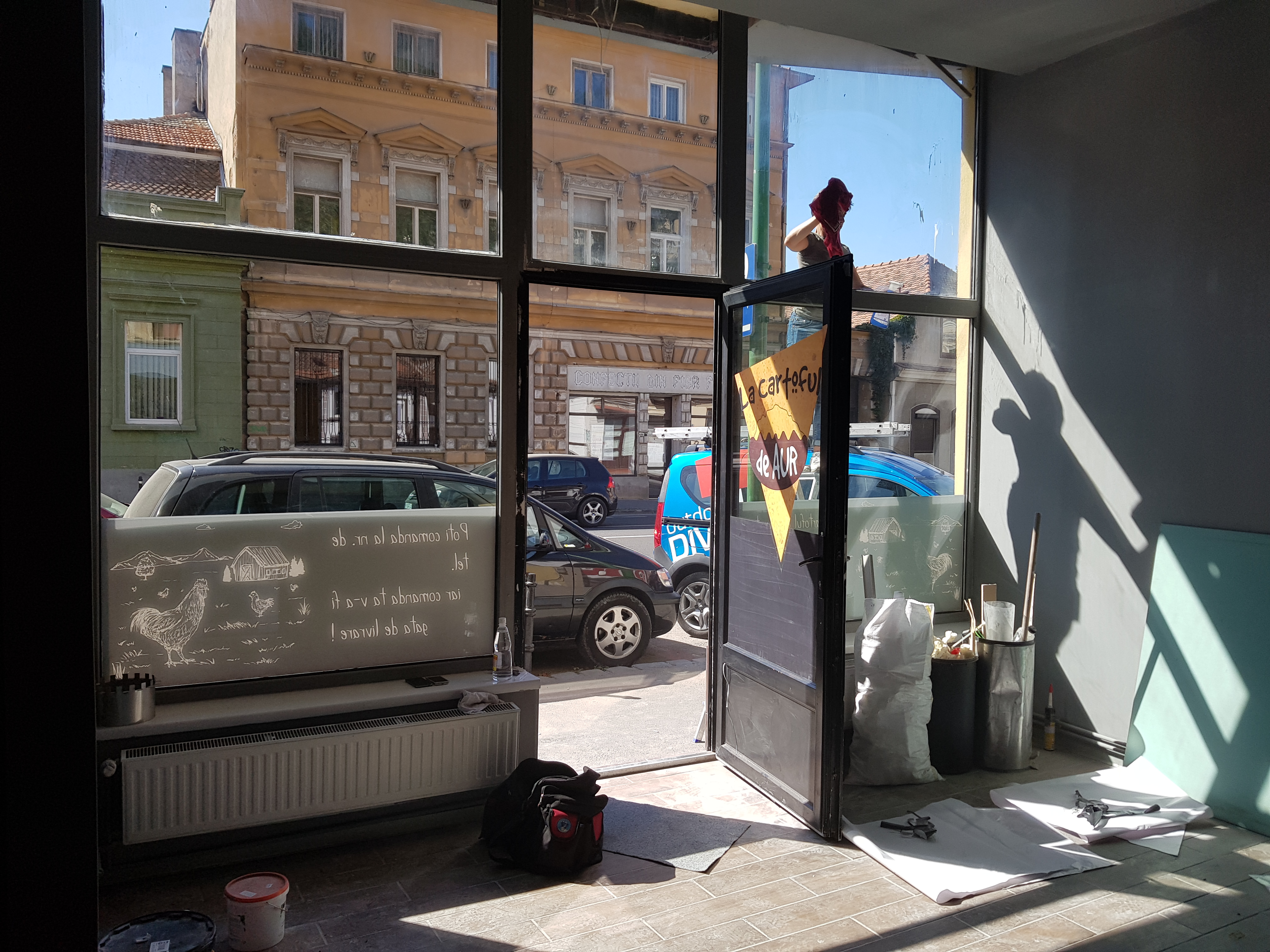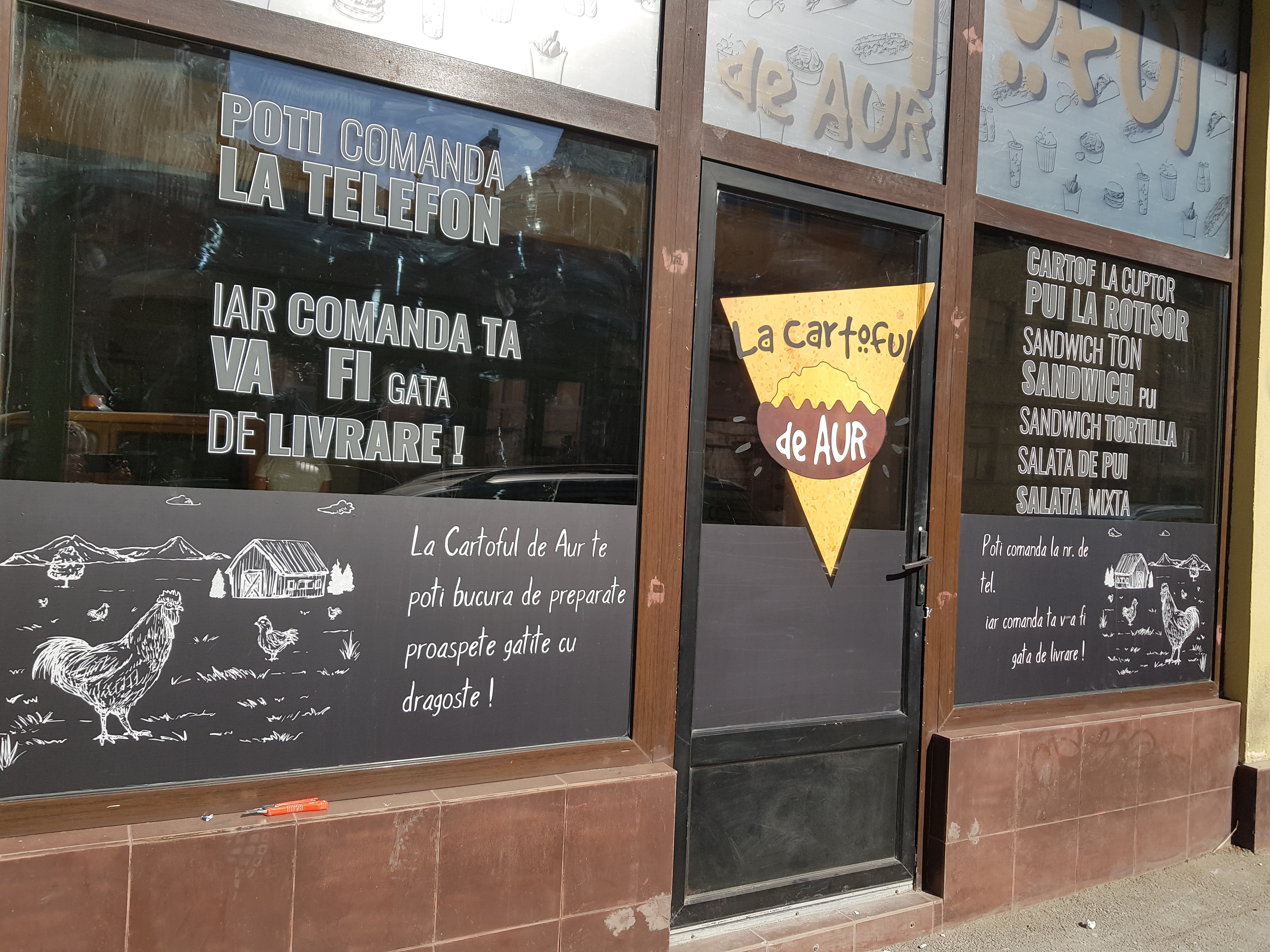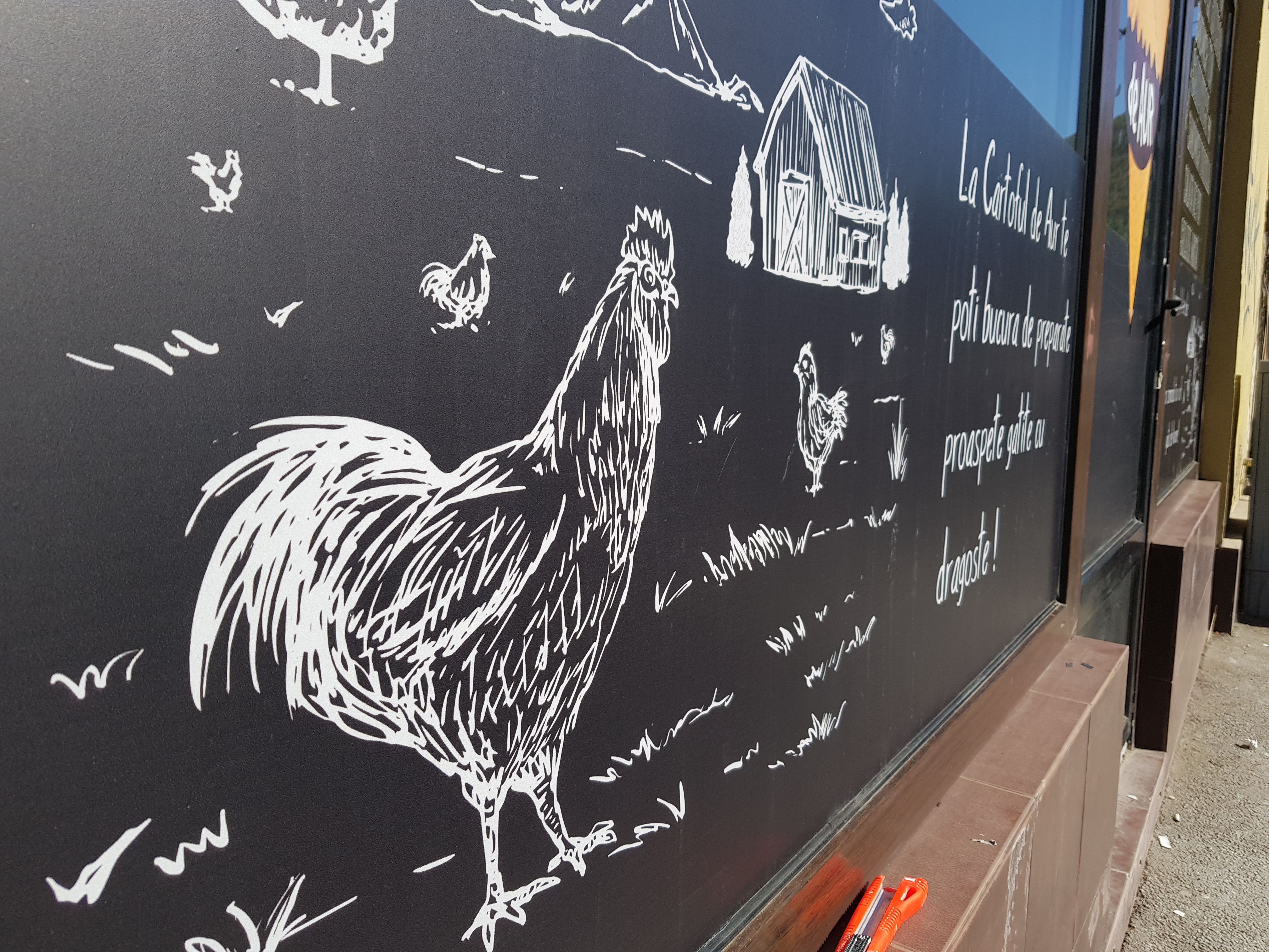 Inscripționarea cu autocolant vitrine (autocolant decupat la cutter-ploter) într-o paleta foarte larga de culori și nuanțe (mărci Oracal/3M) a datelor de contact, sigla (logo) si informații necesare familiarizării clientului final cu produsul ofertat.