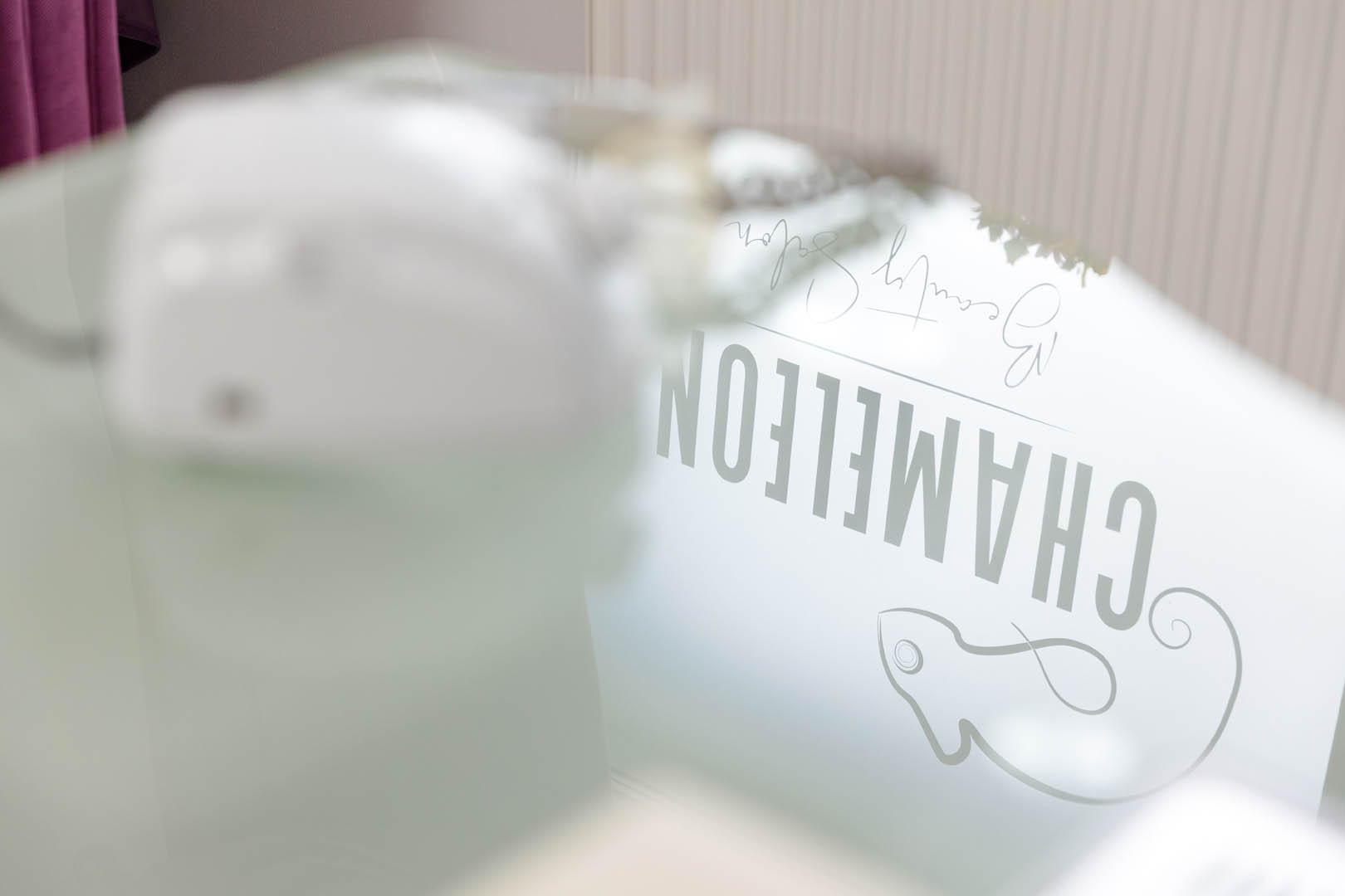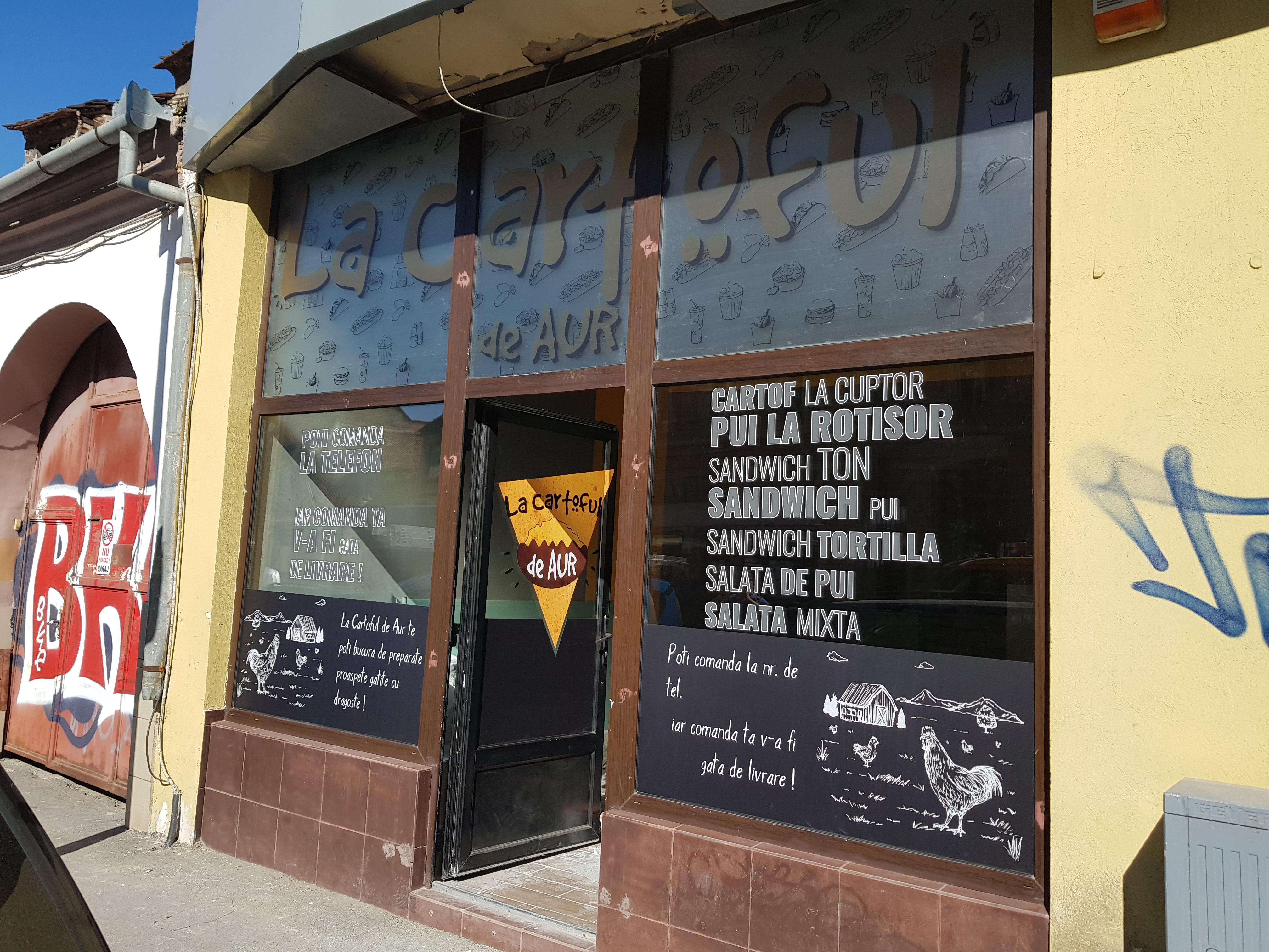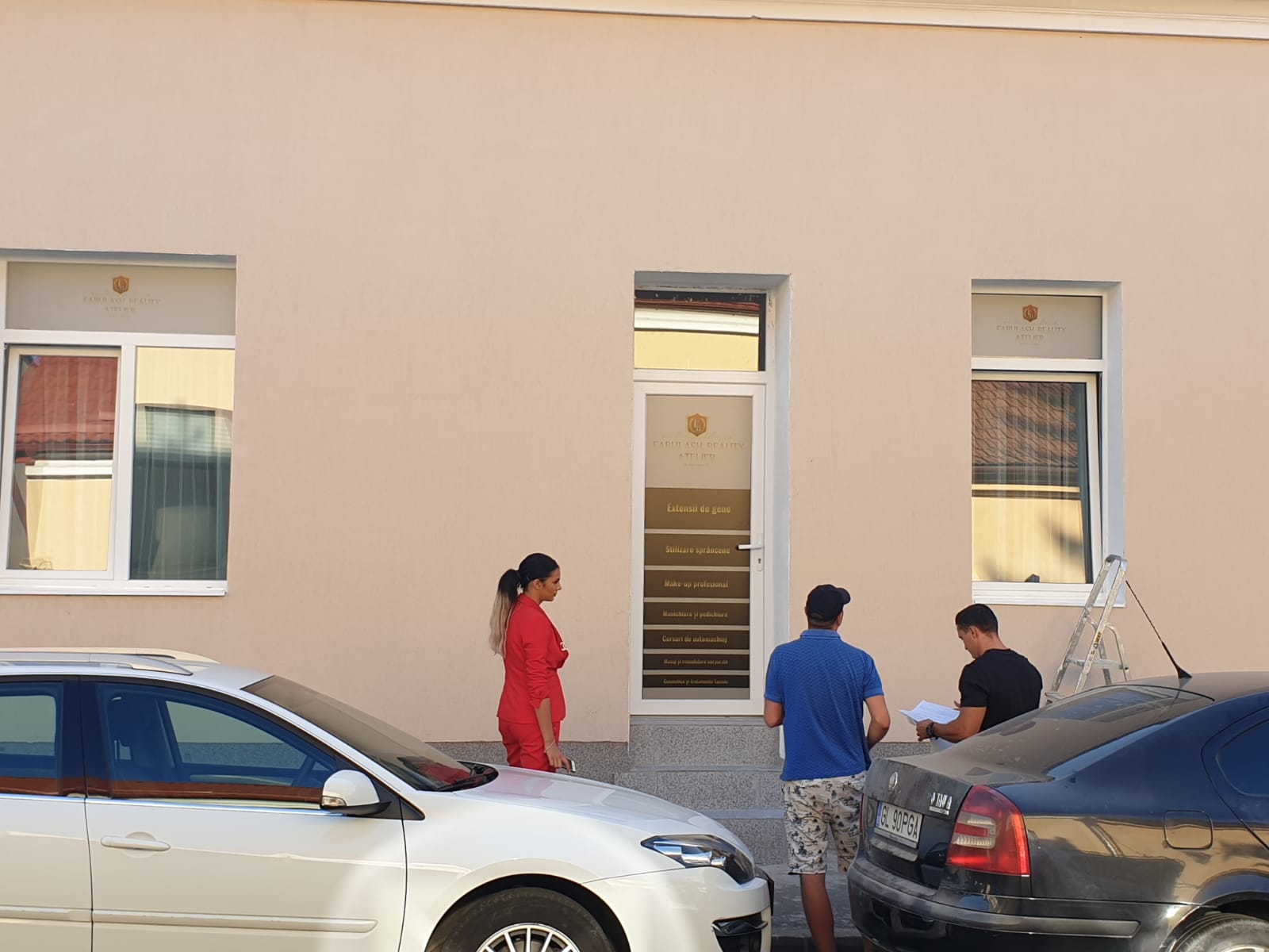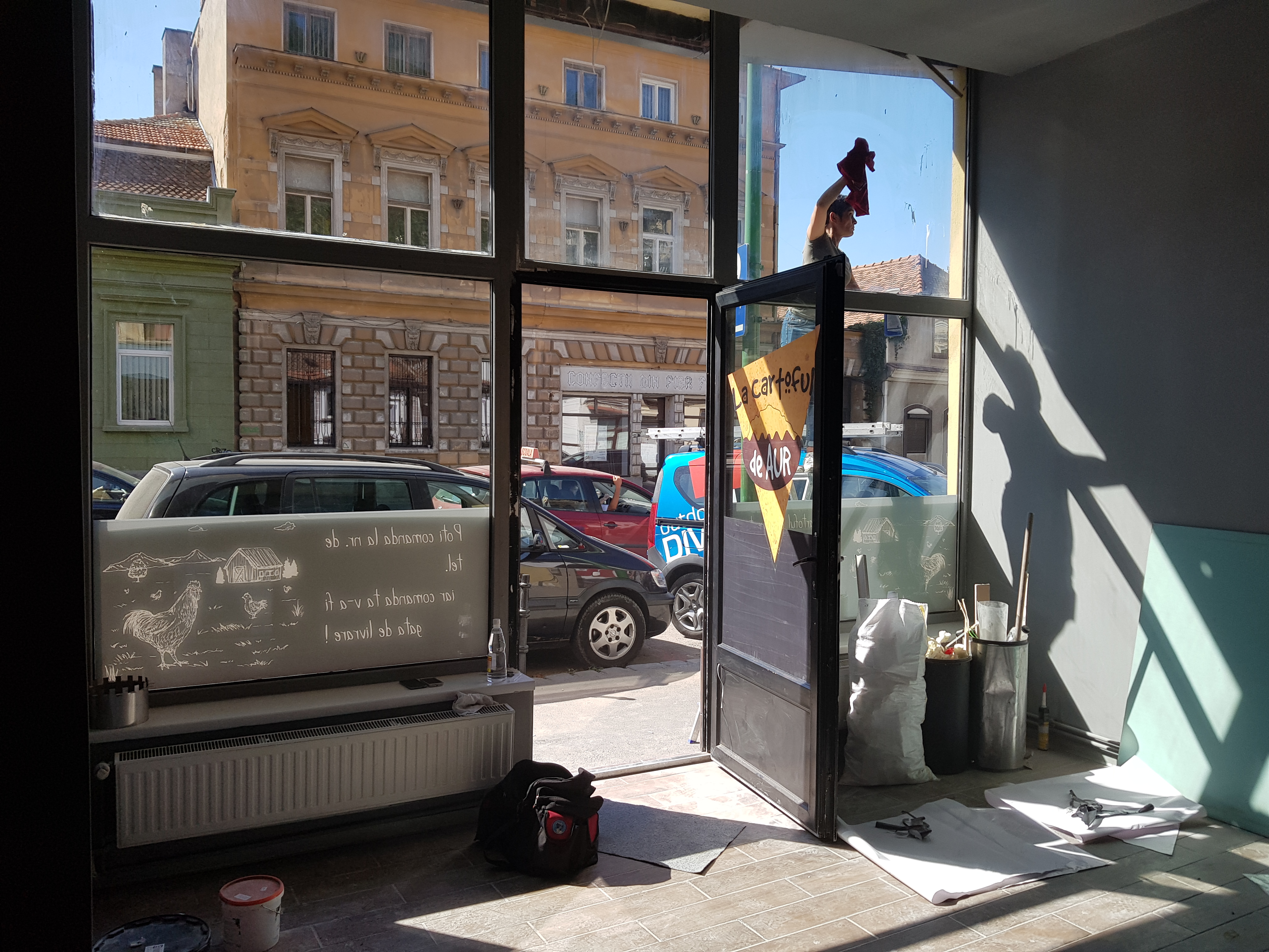 Inscripționarea cu autocolant vitrine (autocolant decupat la cutter-ploter) într-o paleta foarte larga de culori și nuanțe (mărci Oracal/3M) a datelor de contact, sigla (logo) si informații necesare familiarizării clientului final cu produsul ofertat.